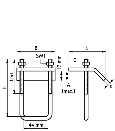 | Code article | A (mm) | G | L | B (mm) | H (mm) | s (mm) | Lm1 (mm) | SW1 (mm) | Fa,z (N) |