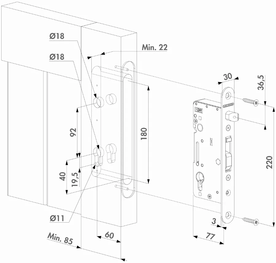 - Serrure à encastrer 100% acier inoxydable avec un axe de 60 mm (têtière – cylindre) spécialement conçue pour les portes battantes en bois.