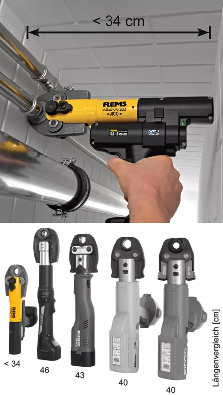 - Sertisseuses radiales REMS Mini-Press ACC / Mini-Press 22 V ACC / REMS Mini-Press S 22 V ACC pour la réalisation d’assemblages par raccord à sertir avec tous les systèmes à sertir courants sur tubes acier, acier inoxydable, cuivre, plastique et multicouche